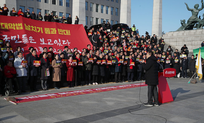 이번 규탄대회는 국회에서 여는 여섯 번째 집회로, 한국당은 지난 20일과 같이 당 지도부와 의원 및 당원들이 참석하는 가운데 경내에서 집회를 끝낼 예정이다. 앞서 한국당은 지난 17∼19일에는 국회 밖으로 이동해 지지자들과 함께 규탄대회를 이어갔다.