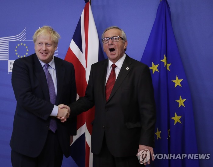 보리스 존슨 영국 총리(왼쪽)와 장클로드 융커 EU 집행위원장이 17일(현지시간) 벨기에 브뤼셀 EU 본부에서 기자회견을 준비하며 악수하고 있다. |