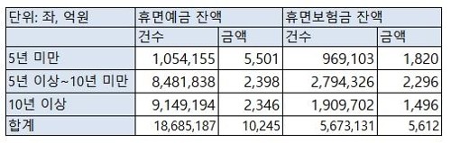 자금의 휴면 기간별로 살펴보면 5년 미만 휴면상태인 휴면예금은 5천501억원(105만좌), 휴면보험금은 1천820억원(96만좌)이 있다.