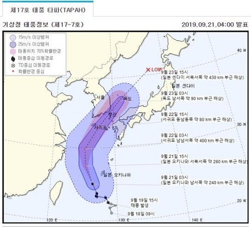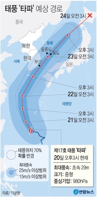 21일 오전 4시 기준 태풍 '타파' 정보/연합