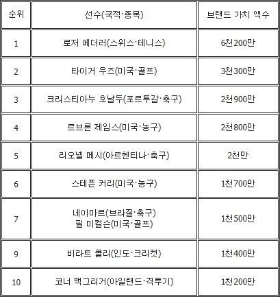 포브스는 "이 브랜드 가치 순위는 브랜드 명칭이 해당 선수나 팀, 이벤트, 비즈니스 분야의 가치를 얼마나 높이느냐를 측정한 결과"라고 설명했다.