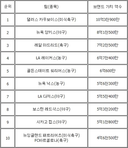 팀 브랜드 가치에서는 미국프로풋볼(NFL) 댈러스 카우보이스가 10억3천900만달러로 1위, 메이저리그 뉴욕 양키스가 8억1천500만달러로 2위다.