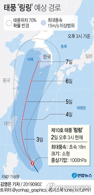 윤기한 기상청 통보관은 "'링링'은 대만과 중국 상하이 동쪽 해상을 거쳐 이번 주 후반 우리나라 부근으로 북상할 가능성이 크다"며 "우리나라는 6∼7일 주로 영향을 받을 것으로 보인다"고 전했다.