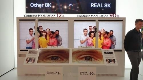 TV사업운영센터장인 박형세 부사장은 7일(현지시간) 현지 간담회에서 독일 화질 인증기관인 VDE 등의 자료를 인용, "LG 나노셀 8K TV의 화질 선명도(CM)는 90%로 나온 데 비해 삼성 QLED 8K TV는 12%로 나왔다"면서 "(삼성 TV는) 픽셀 수로는 8K가 맞지만 해상도 기준으로는 8K가 아니다"고 잘라 말했다.