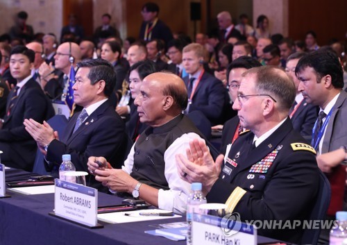 정경두 국방부 장관(왼쪽부터)과 라즈 나트 싱 인도 국방장관, 로버트 에이브럼스 한미연합사령관/연합