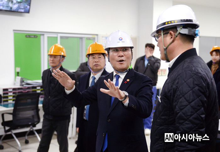 ▲ 성윤모 산업통상자원부 장관(오른쪽 세번째)이 2020년 1월 2일 오후 공주 솔브레인 공장에 방문해 반도체·디스플레이용 고순도 불산액(액체 불화수소) 공급 안정화 현황을 점검하고 있다. 산업통상자원부 제공 |