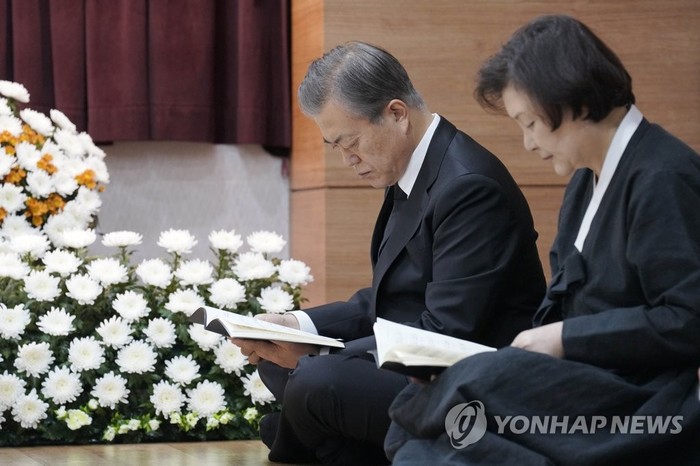 ▲ 문재인 대통령과 김정숙 여사가 30일 오전 부산 남천성당에 마련된 모친 고 강한옥 여사의 빈소에서 위령미사를 드리고 있다. |
