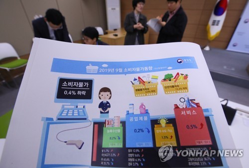▲ 9월 소비자물가 0.4% 하락…사상 첫 공식 마이너스 물가 9월 소비자물가지수는 105.2(2015년=100)로 1년 전보다 0.4% 하락했다. 직원들이 취재진의 질문에 답하고 있다. |