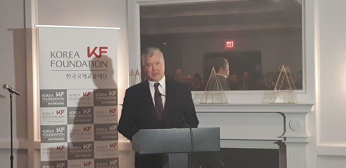 ▲ 스티븐 비건 미국 국무부 부장관 지명자가 3일(현지시간) 워싱턴DC에서 열린 한국국제교류재단(KF) 워싱턴사무소 송년 행사에 참석, 인사말을 하고 있다. 연합뉴스 제공 |
