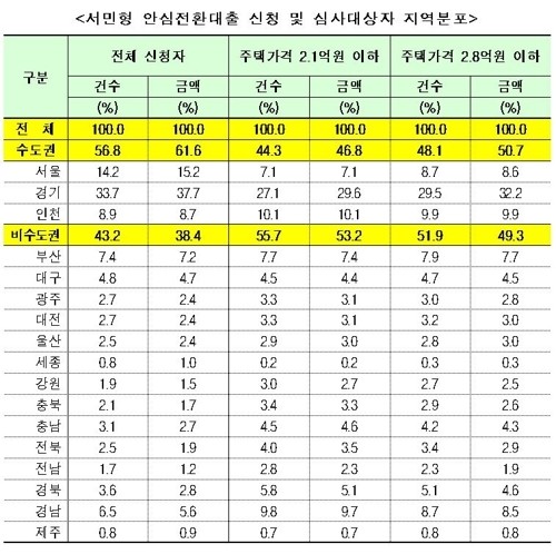 이런 이유로 전체 수도권 신청자의 비중은 56.8%이지만 2억1천만원으로 커트라인을 설정하면 비중이 44.3%로 줄어든다.