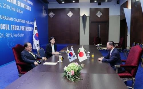 지난 24일 카자흐스탄 누르술탄 독립 궁전에서 열린 ‘제4차 유라시아 국회의장 회의’에 문 의장이 참석했다. 이 회의에 일본 측 대표로 참석한 가와무라 간사장과 문 의장의 만남이 성사 됐다. 한국 관계자에 따르면 일본 측에서 문 의장을 꼭 만나고 싶었다는 요청이 있어서 만남이 성사될 수 있었던 것이다. 또한 이 관계자는 “(일본 측)면담 내용에 대해선 비공개로 해달라는 요구가 있었다”고 설명했다.