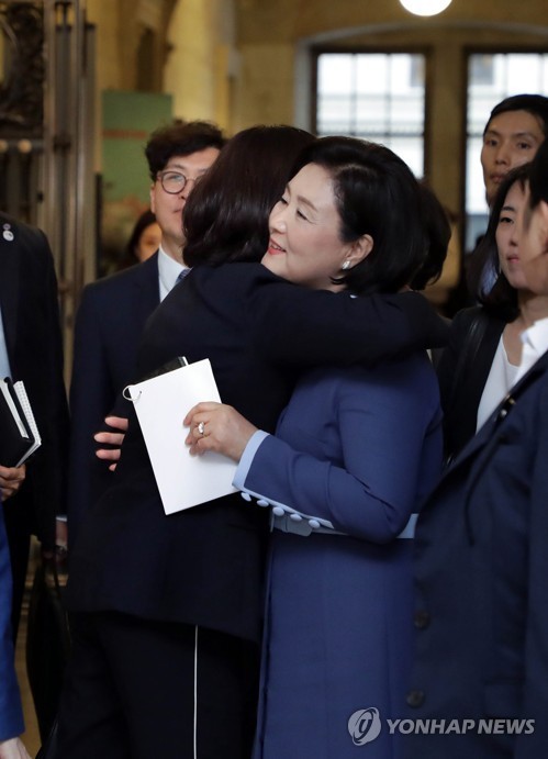 문재인 대통령 부인 김정숙 여사와 일본 아베 신조 총리 부인 아키에 여사가 24일 오후(현지시간) 뉴욕 공립도서관에서 열린 유니세프 주최 '발달장애인을 위한 보편적 의료보장 콘퍼런스'를 마친 뒤 헤어지며 포옹하고 있다.