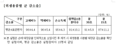 조사 결과 세균 평균감소율은 고체비누와 액체비누가 각각 96%로 가장 높았으며 손 소독제 95%, 접객업소용 물티슈 91%, 흐르는 물 30초 91%, 흐르는 물 15초 87% 등의 순으로 조사됐다.