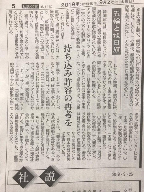 | ▲ 일본 정부가 전범기인 욱일기의 내년 도쿄 올림픽·패럴림픽 경기장 반입을 허용할 방침인 것을 비판한 도쿄신문의 25일자 사설 |