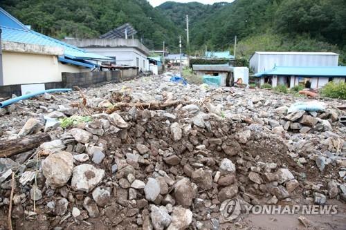 ▲ 하천 메운 돌 3일 경북 울진군 매화면 금매2리에서 태풍 '미탁' 영향으로 많은 비가 내려 마을 뒷산에서 흙과 돌이 무더기로 쏟아져 깊이 2m인 하천을 모두 메웠다. |