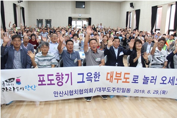 안산시가 안산시협치협의회 주관으로 8월 29일 오후2시부터 5시까지 대부도 주민 150여명이 참석한 가운데 대부동동 대부문화센터에서 ‘대부도 생활 인프라 개선을 위한 대부도 주민 대토론회를 개최했다. 윤화섭 시장과 시의회 나정숙 도시환경위원장 등이 안산으로 놀러오세요라고 외치고 있다.