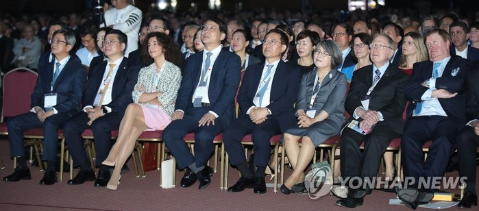 서울 코엑스에서 열린 '2019 세계변호사협회 총회' 개막식에 김명수 대법원장(왼쪽) 등 참석자들이 착석해 있다./연합