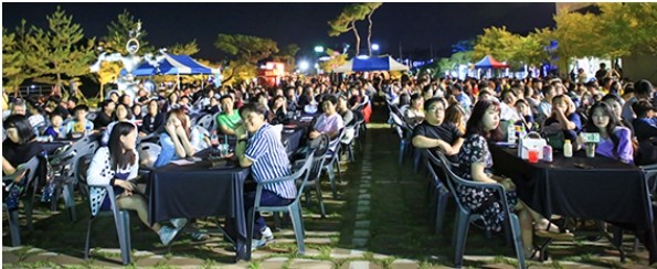제5회 포도밭 착한 음악회가 8월31일 토요일 오후 7시부터 9시까지 2시간 동안 대부도 유리섬박물관 앞마당에서 펼쳐졌다. 많은 시민들이 환호성을 지르며 즐거워하고 있다.