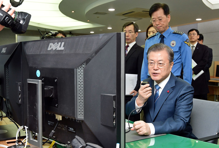 ▲ 문재인 대통령이 3일 오전 경기 평택항 마린센터를 방문, 해상교통관제센터에서 선박과 교신을 하고 있다.