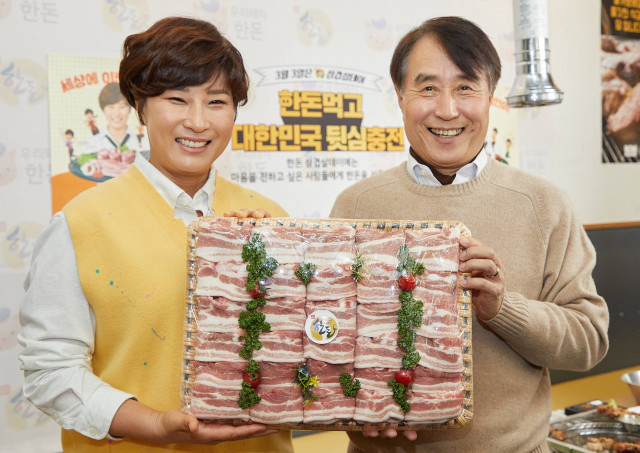 ▲ 왼쪽부터 박세리 한돈 홍보대사와 하태식 한돈자조금 위원장이 한돈 삼겹살데이 기념식에 참석해 삼겹살 선물 세트를 주고 받으며 기념 촬영을 하고 있다/ 사진 = 한돈 제공. |
