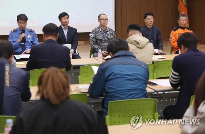 ▲ 독도 헬기 추락사고 발생 8일째인 지난 7일 오후 대구 달성군 강서소방서 3층에 마련된 범정부현장수습지원단 브리핑실에서 지원단 관계자들이 추락 헬기 탑승원 가족들에게 수색 상황에 대해 브리핑하고 있다. |