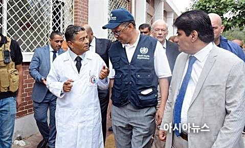 ▲ 테워드로스 아드하놈 거브러여수스 WHO 사무총장(가운데). WHO 제공 |