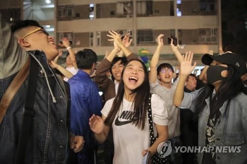 ▲민주 진영 승리에 환호하는 홍콩 시민들.연합제공 |