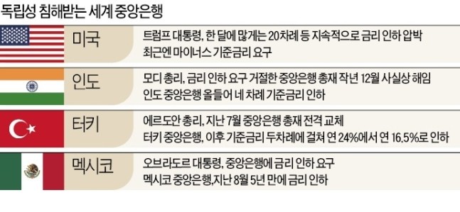 글로벌 경기 둔화가 이어지는 가운데 미국 인도 터키 멕시코 등 세계 각국에서 중앙은행의 독립성이 위협받고 있다. 경기 부양을 통해 득표하려는 정치인들이 중앙은행을 흔들고, 총재를 해임하거나 사퇴시키는 일까지 발생하고 있다. 중앙은행의 통화정책 신뢰성 확보를 위해 독립이 필요하다는 전통적 시각이 여전한 가운데, 저금리·디플레이션 시대에는 독립성보다 행정부와의 정책 공조가 필요하다는 주장도 나온다.