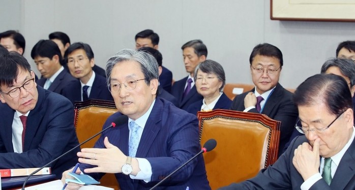 ▲ 노영민 대통령 비서실장이 29일 국회 운영위원회 전체회의에 질의에 답변하고 있다. 왼쪽부터 김상조 정책실장, 노 비서실장, 정의용 국가안보실장. 연합뉴스 제공 |
