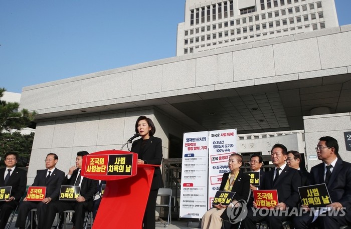 나 원내대표는 이날 서울 서초동 대법원 앞에서 ‘문재인 정권 사법농단 규탄’ 현장 국정감사대책회의를 열고 “조국 전 민정수석 동생에 대한 구속영장 기각 결정은 장악된 사법부가 보이는 사법 농단의 결정판”이라 밝혔다.
