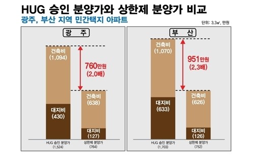 ▲ 주택도시보증공사(HUG) 승인 분양가와 상한제 적용시 분양가 비교 |