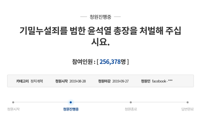 기밀누설죄 윤석열 검찰총장 청와대 국민청원 20만명 돌파