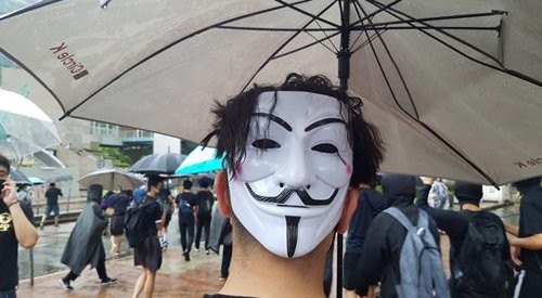 | ▲ 복면금지법 시행에 반대해 '가이 포크스' 가면을 쓴 홍콩 시위자 지난 6일 한 홍콩 시위자가 정부의 복면금지법 시행에 반대해 '가이 포크스' 가면을 쓰고 있다. |