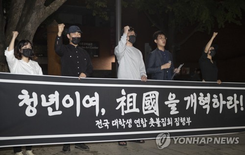 지난 30일 서울 마로니에 공원에서 열린 '전국대학생연합' 촛불집회에서 집행부 학생들이 "조국 장관 사퇴" 구호를 외치고 있다. |