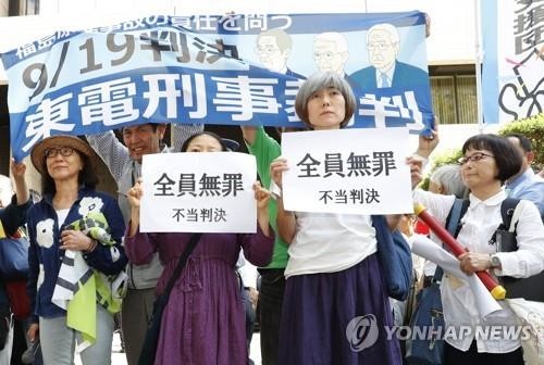 | ▲ 2019년 9월 19일 일본 도쿄지방재판소(법원)가 후쿠시마 원전 사고와 관련해 강제기소된 원전 운영사 도쿄전력의 옛 경영진에 무죄 판결을 내리자 시민들이 재판소 앞에서 판결에 항의하고 있다. |