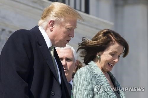 의사당 계단서 펠로시 하원의장과 대화하는 트럼프 대통령/연합