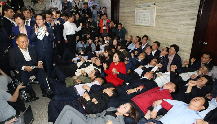 ▲ 4월26일 당시 국회 회의실 앞에 드러누워 진입 막는 자유한국당. 연합뉴스 제공 |