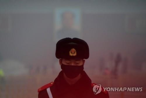 | ▲ 베이징 대기오염을 보여주는 상징적인 사진. 대기오염 적색경보가 발령된 날 톈안먼 광장의 마오쩌둥 초상화 앞에서 공안 요원이 마스크를 쓰고 경비를 서고 있다. |
