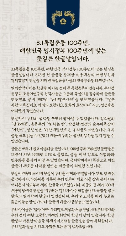 아울러 "우리 글을 쓰고 읽을 수 있었기 때문에 우리는 삼천리강산을 잊지 않을 수 있었다"고 역설했다.