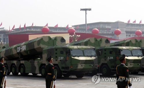 ▲ 중국 열병식에 등장한 둥펑-100 미사일 1일 오후 신중국 건국 70주년 기념일을 맞아 베이징(北京) 톈안먼(天安門) 광장에서 열린 역대 최대 규모의 열병식에 둥펑(DF)-100 미사일이 등장했다. |
