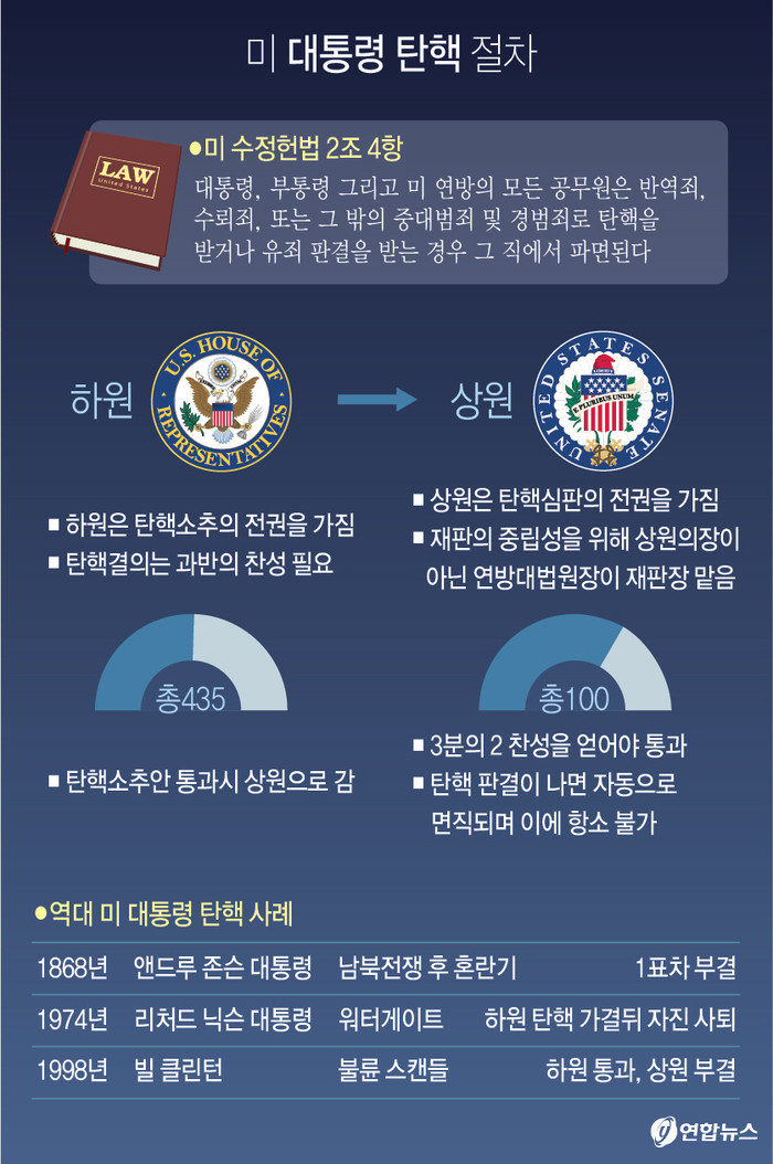 미국의 현직 대통령 탄핵 절차는 하원의 탄핵 조사를 거쳐 탄핵소추안이 제출돼 과반 찬성으로 통과되면 상원에서 탄핵 재판이 진행되는 방식으로 진행된다.