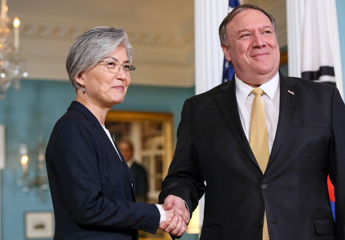 ▲ 강경화 외교부 장관이 지난 2019년 3월 29일(현지시간) 오후 워싱턴D.C.에서 마이크 폼페이오 미 국무부 장관과 '하노이 회담' 이후 첫 한미외교장관 회담을 하며 인사하고 있다. 연합뉴스 제공 |