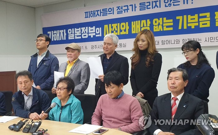 6일 오후 광주시의회 시민소통실에서 근로정신대 할머니와 함께 하는 시민모임이 강제징용 문제 해법으로 문희상 국회의장이 제안한 '1+1국민성금(α)'안을 반대하는 기자회견을 하고 있다. |