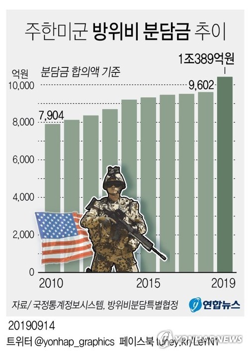 올해 한국의 방위비 분담금 규모는 1조389억원이다.
