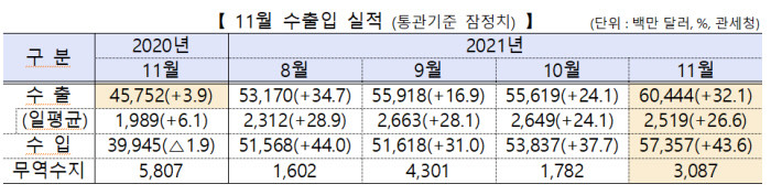 산업통상자원부는 11월 수출액이 전년 동기 대비 32.1% 증가한 604억4000만달러로 집계됐다고 1일 발표했다. 이는 무역통계 집계를 시작한 1956년 이래 월간 기준 최대 규모다. 올해 1~11월 누적 수출액은 5838억달러, 무역액은 1조1375억달러로 동 기간 기준 역대 최고치다.