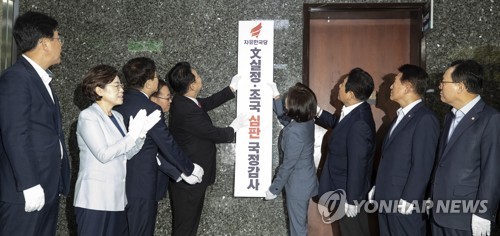 한국당 나경원 원내대표는 이날 국정감사 종합상황실 현판식에서 "문재인 정권의 무능과 부도덕을 낱낱이 파헤쳐달라"며 "조 장관을 저희가 꼭 심판해야 한다"고 강조했다.