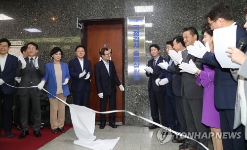 | ▲ 민주당, 국정감사 종합상황실 현판식 더불어민주당 이해찬 대표와 이인영 원내대표가 30일 오전 국회에서 국정감사 종합상황실 현판식을 하고 있다. |