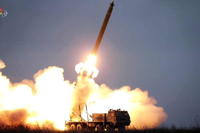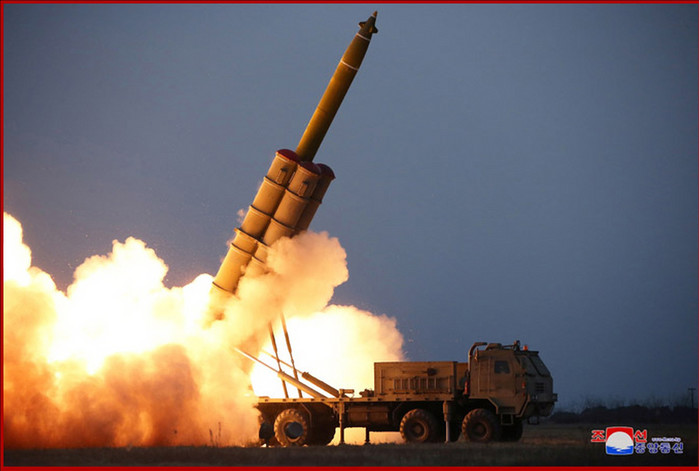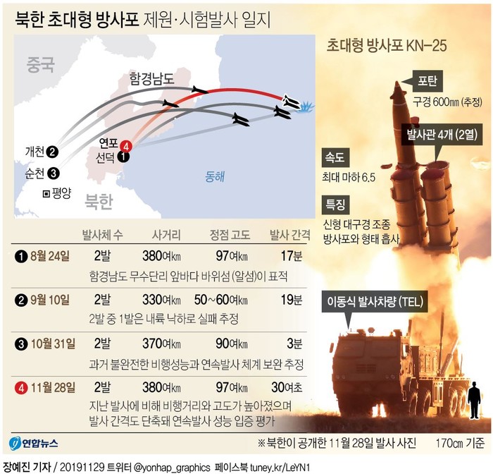 북한 관영 매체들은 29일 초대형 방사포가 이동식발사차량(TEL)에 탑재된 발사관에서 점화되어 솟구치는 사진을 공개했다. 전날 오후 4시 59분께 함경남도 연포 일대에서 발사된 2발은 정점고도 97㎞로, 380㎞를 비행해 동해에 낙하했다.