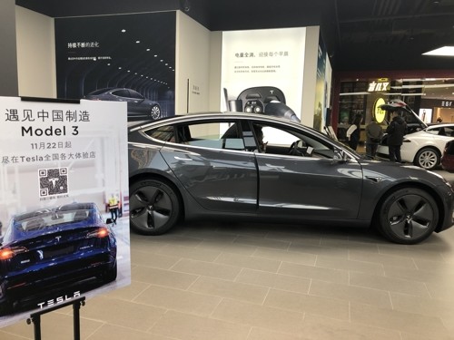 ▲'메이드 인 차이나' 테슬라 모델3 4일 중국 상하이 쇼핑몰 래플스에 자리 잡은 테슬라 매장에 상하이 공장에서 생산된 중국산 모델3가 전시되어 있다. 연합뉴스 제공 |