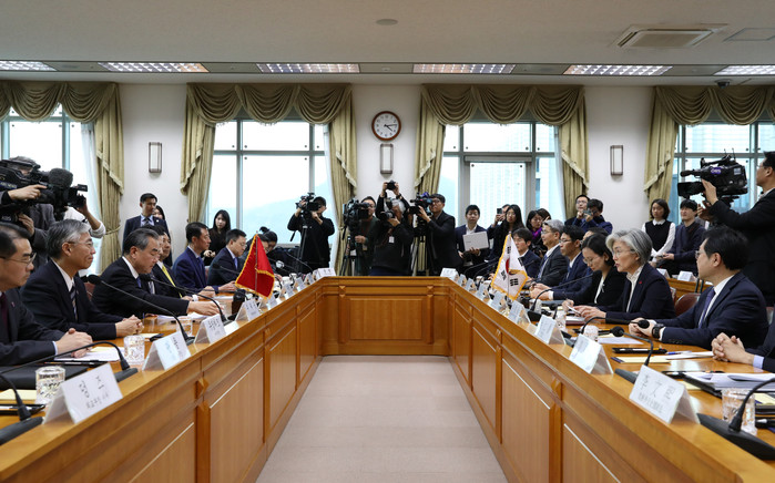 강경화 외교부 장관과 왕이(王毅) 중국 외교담당 국무위원 겸 외교부장이 4일 오후 서울 종로구 도렴동 외교부 청사에서 양자 회담을 했다.